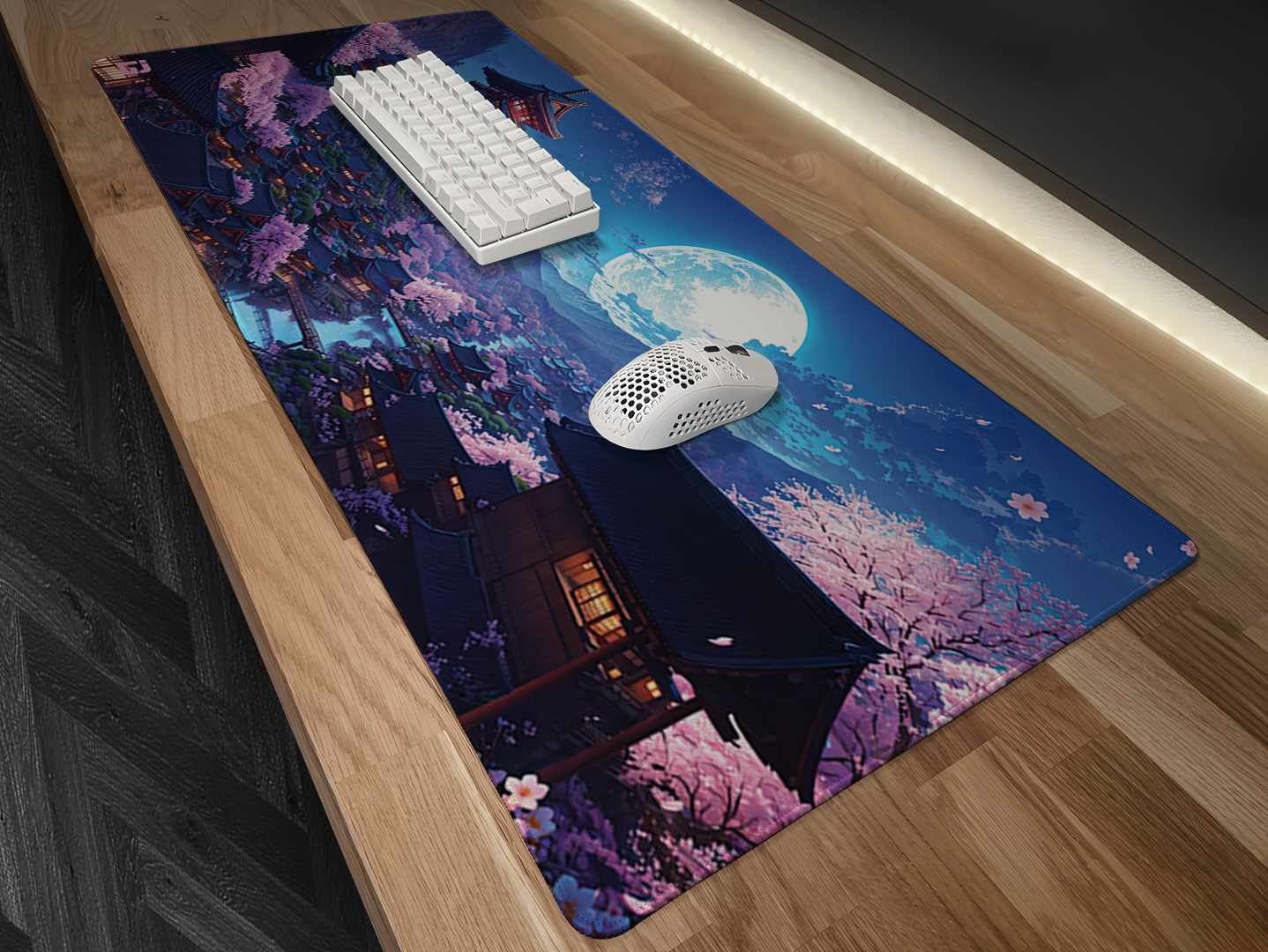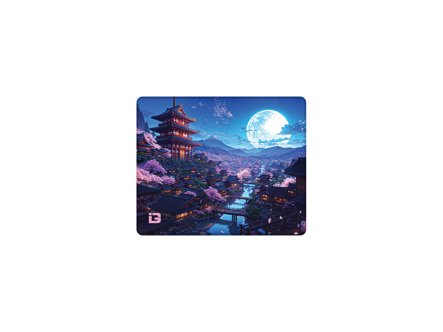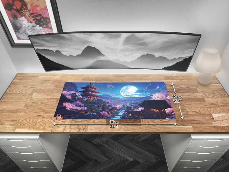 This mousepad is in a striking Japanese style design. This mousepad depicts a night sky with the moon shining brightly over a village in Japan with multiple Sakura trees and pagoda style buildings . This mouse mat uses the blue and pink colours and will fit in great most desk setups. This pad is perfect for gaming or for working with a perfectly smooth and flat surface. The pad come with a anti-slip rubber backing so if your gaming hard the pad will never slip so you always have the precision you need. The mouse pad is also equipped with stitched edging to make it comfortable to use all day and night no matter what task you are doing. This pad comes in multiple different sizes so it will fit all desks no matter what size or shape you have. So if you have a Japan themed aesthetic or a blue / pink colour setup this pad could be exactly what you need.