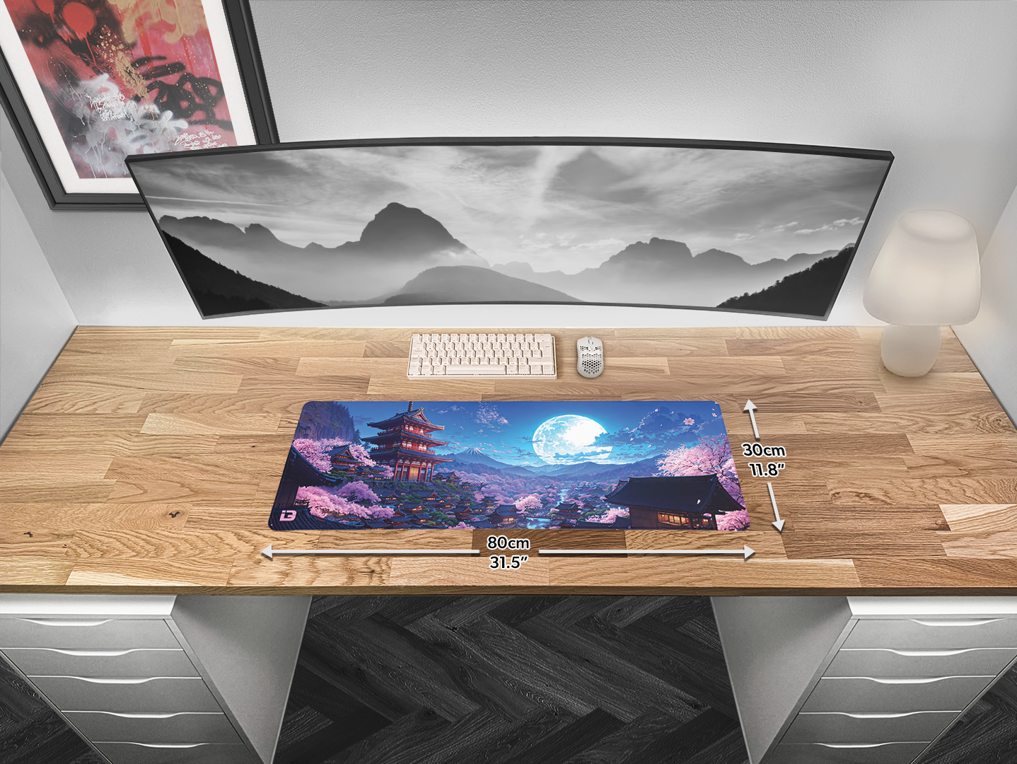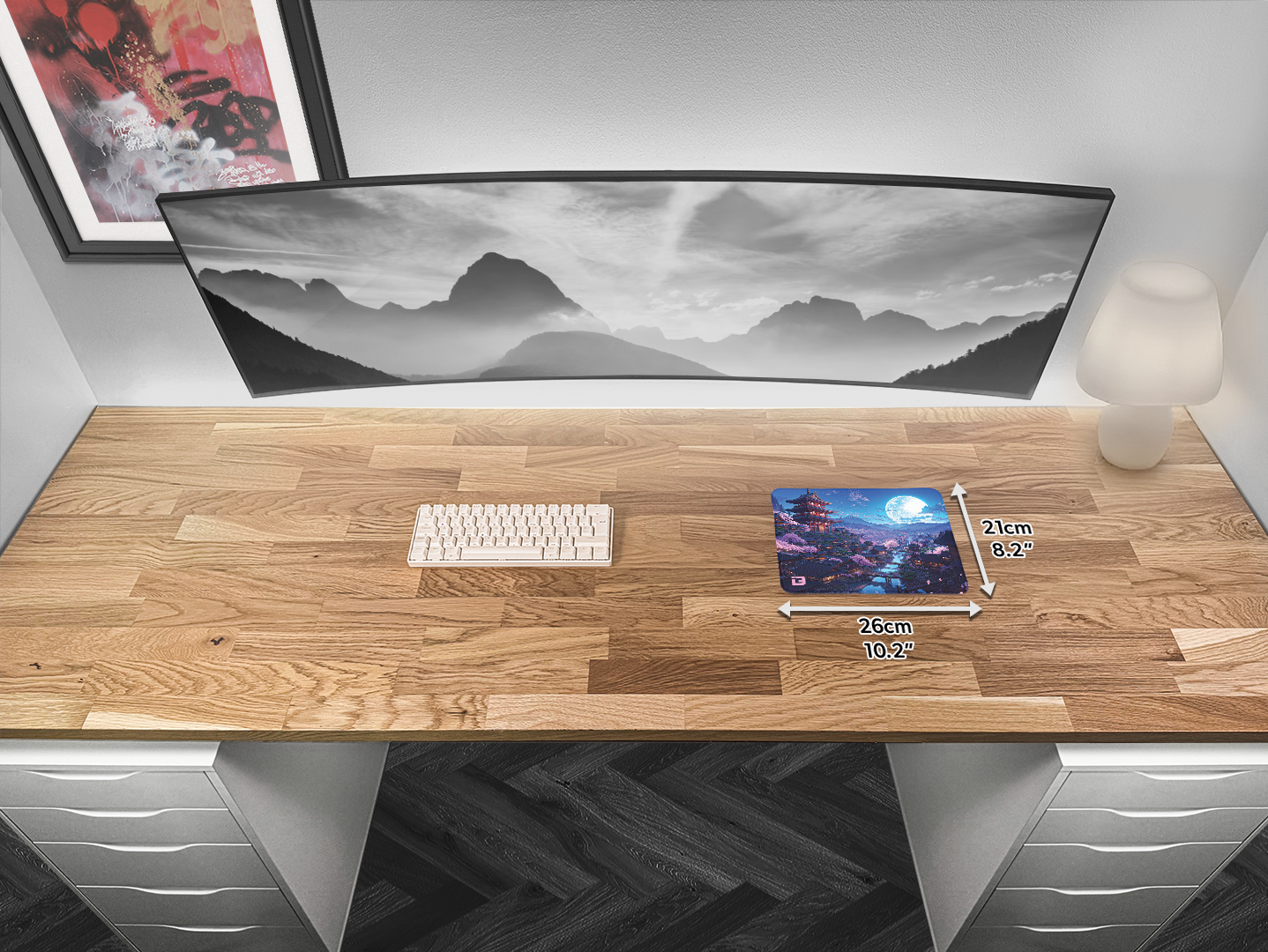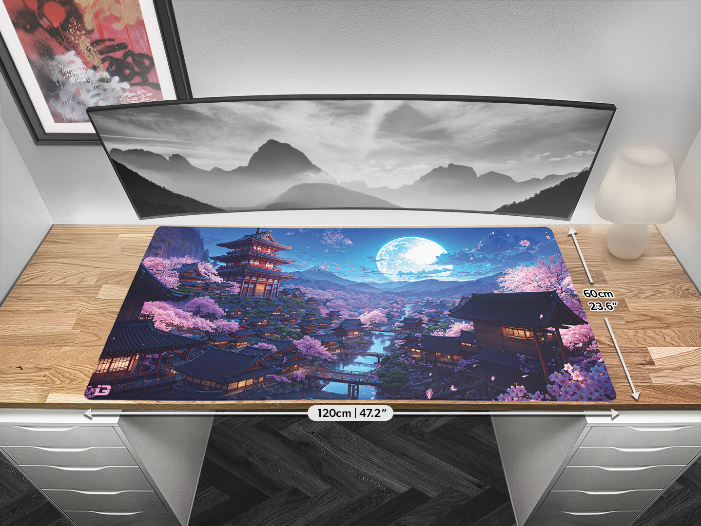 This mousepad is in a striking Japanese style design. This mousepad depicts a night sky with the moon shining brightly over a village in Japan with multiple Sakura trees and pagoda style buildings . This mouse mat uses the blue and pink colours and will fit in great most desk setups. This pad is perfect for gaming or for working with a perfectly smooth and flat surface. The pad come with a anti-slip rubber backing so if your gaming hard the pad will never slip so you always have the precision you need. The mouse pad is also equipped with stitched edging to make it comfortable to use all day and night no matter what task you are doing. This pad comes in multiple different sizes so it will fit all desks no matter what size or shape you have. So if you have a Japan themed aesthetic or a blue / pink colour setup this pad could be exactly what you need.